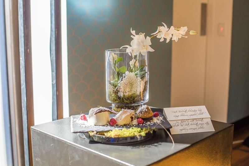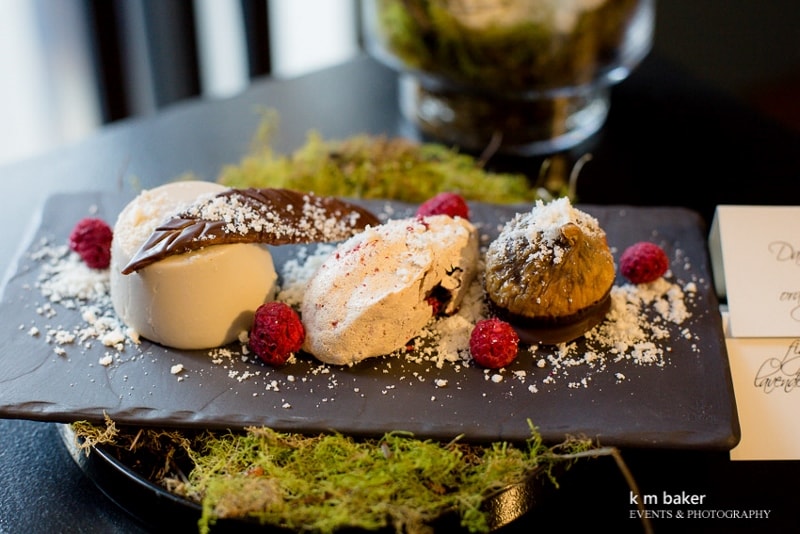 Dark Chocolate clementine leaf, orange blossom ganache filled fig dipped in milk chocolate served with lavender and white chocolate panacotta & raspberry meringue pillows