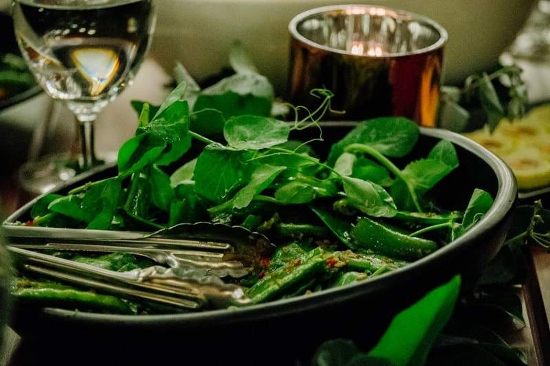 Stir fried snow peas, sugar snaps & tendrils with garlic, chilli & ginger (vg/gf/df)