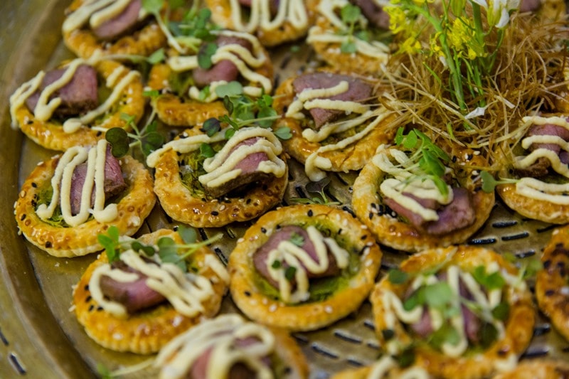 Mini pissaladiere of zucchini, rare lamb, confit garlic hummus (df)
