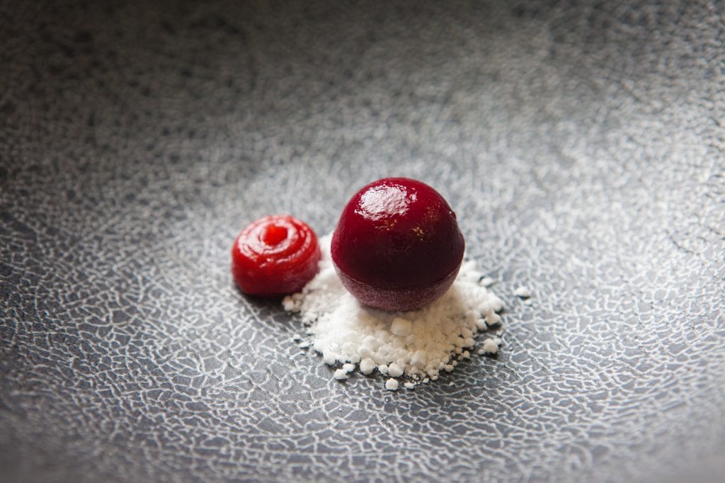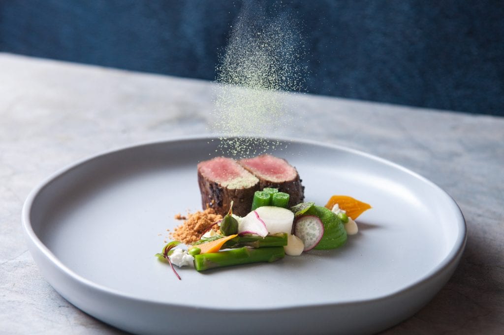 Main of lamb loin, goats cheese, pea, blush turnip and floral ginger crumble
