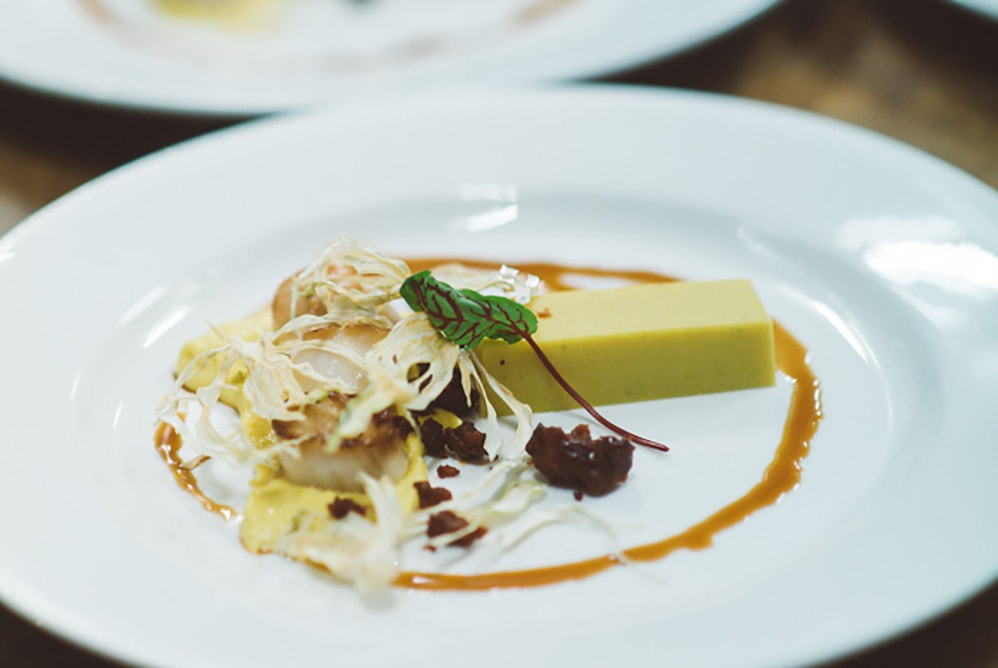 Seared scallop, sweet corn whip, chorizo crumble, caper butter (gf)
