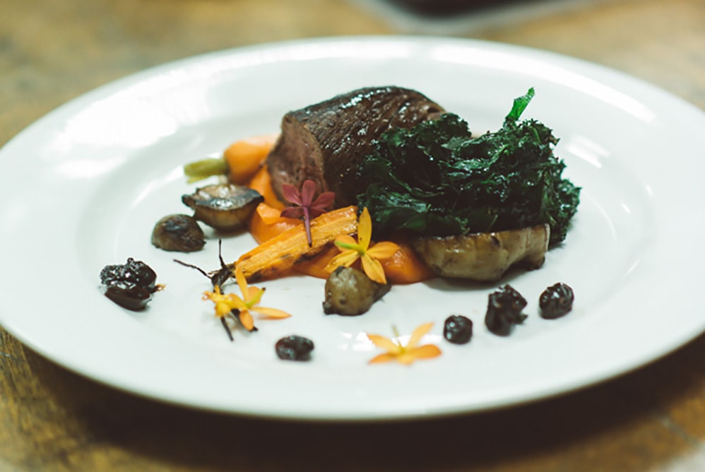 Formed beef medallion, red wine soaked grape, carrot mousse, pan seared kale, Shiraz jus (gf)