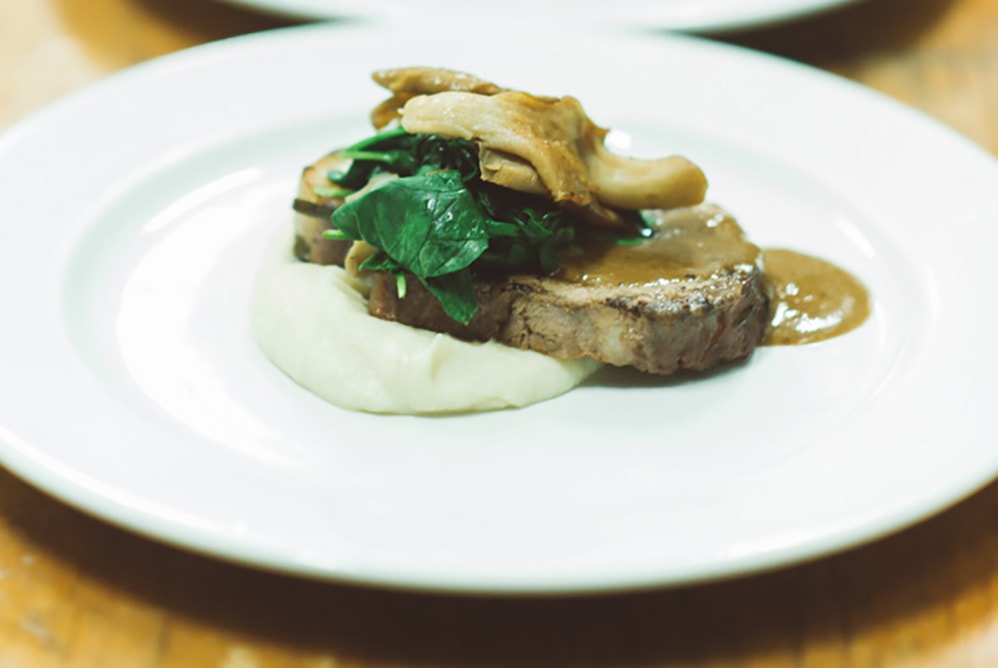 Sous vide pork loin, sautéed mace spinach, parsnip mousse, oyster mushroom cream (gf)